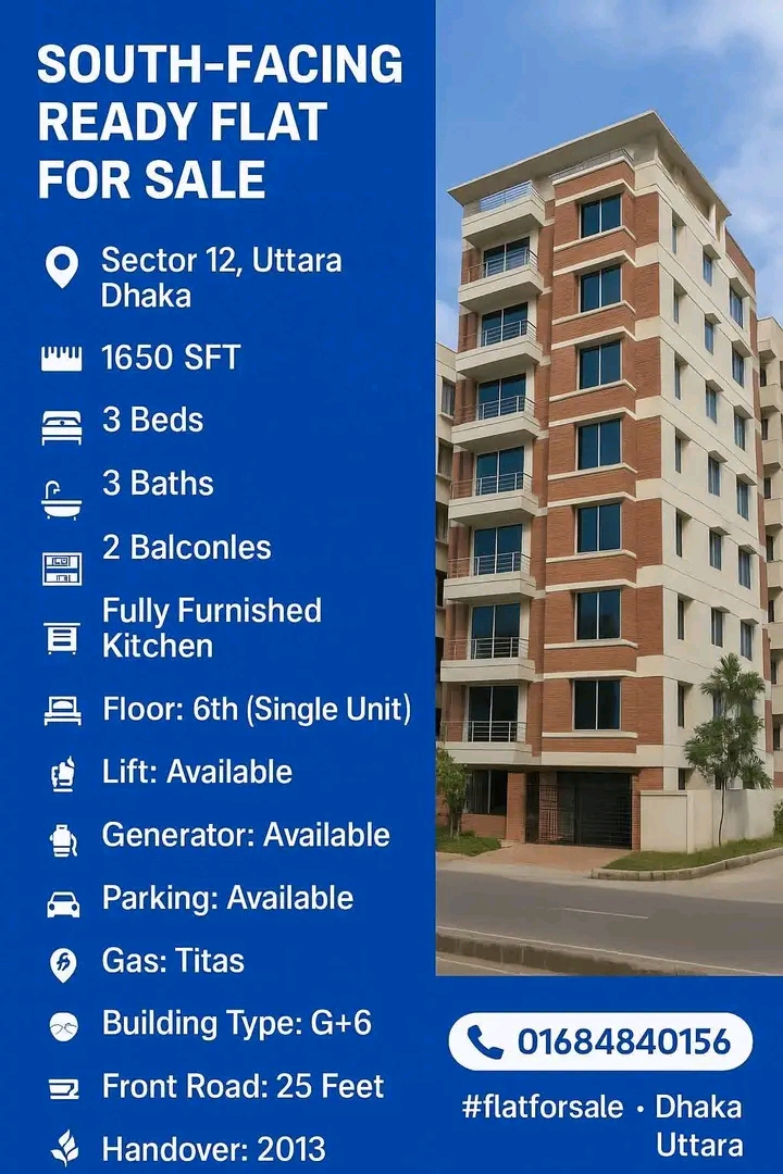 Ready South-Facing Flat for Sale in Sector 12, Uttara | 1,650 Sq. Ft | 3 Beds
